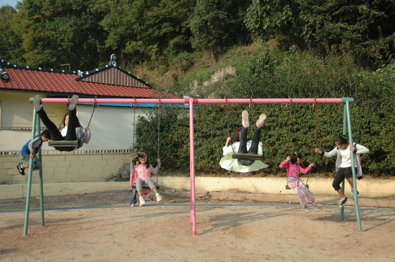 등교 후 수업 시간 전 그네를 타는 초등학교 학생들