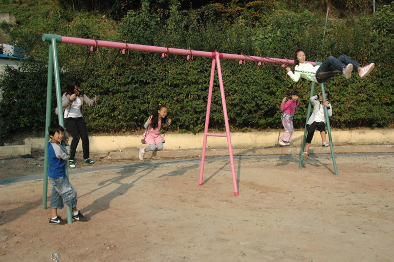 등교 후 수업 시간 전 그네를 타는 초등학교 학생들