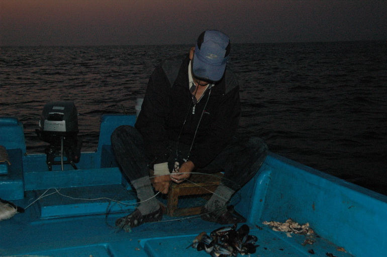 잡아온 쥐치를 마을 앞 방파제 옆에 보관하는 김외삼 씨