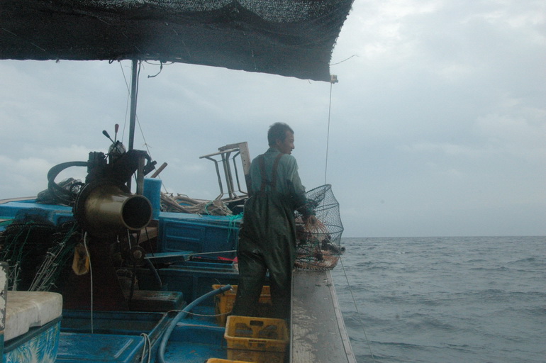 새로운 미끼를 넣어서 통발을 던지는 이상호 씨