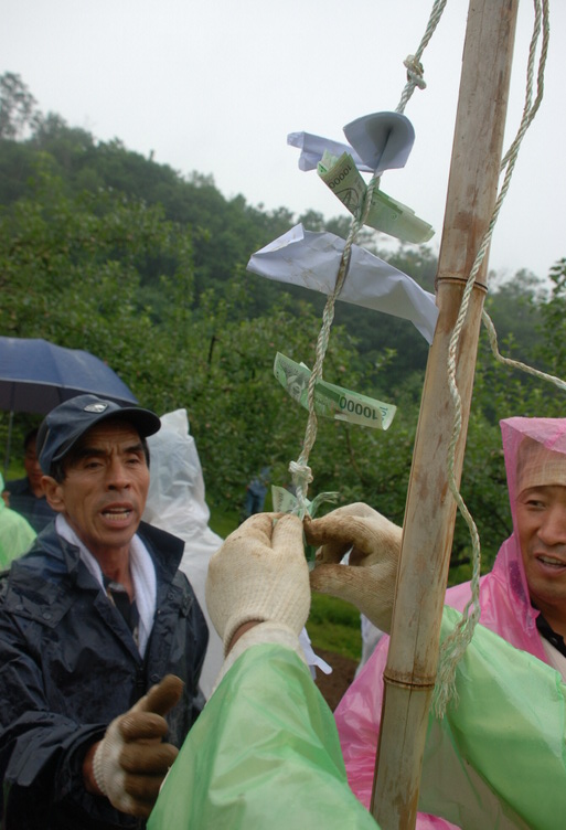 막대기에 돈이 꼽혀 있는 모습