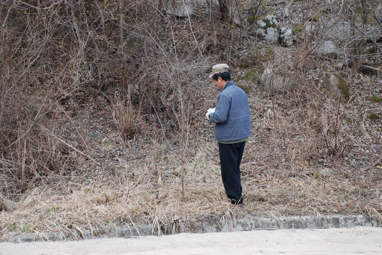한티재 도로 주변에서 산수유를 심는 모습