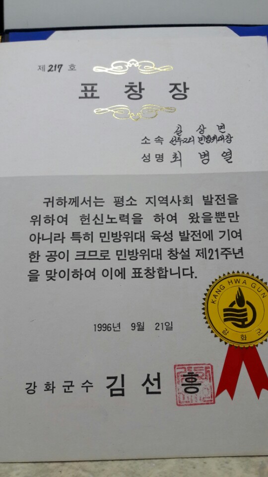 이장을 하면서 받은 군수 표창(1996년)
