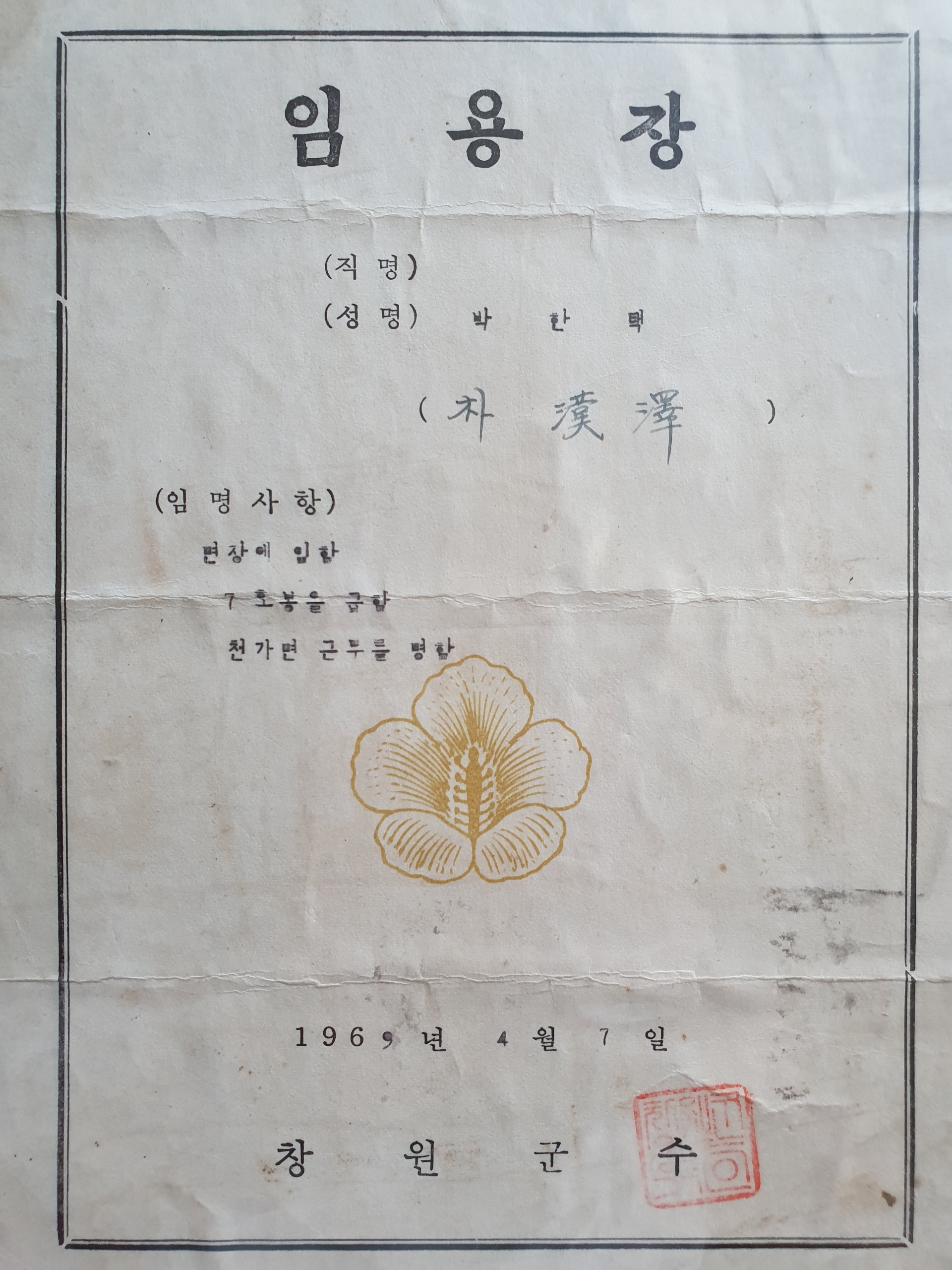 1969년 4월 7일 천가면장 임명장