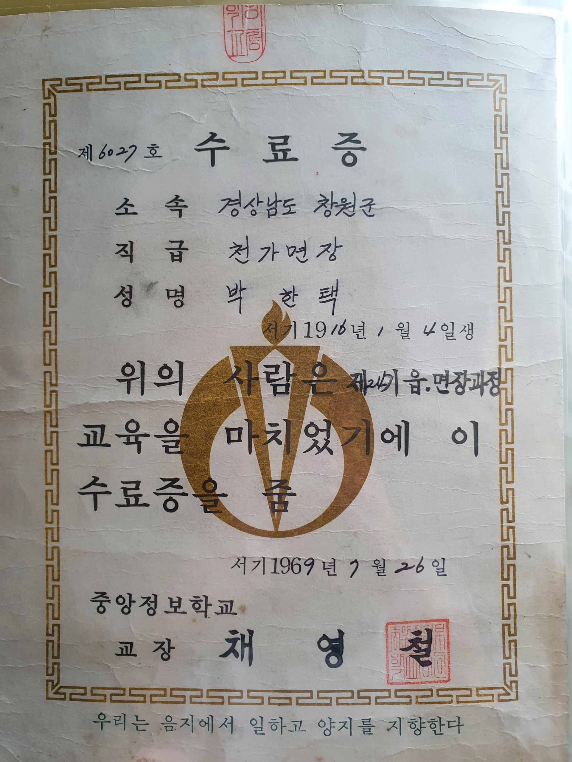 1969년 7월 26일 면장 교육 수료증