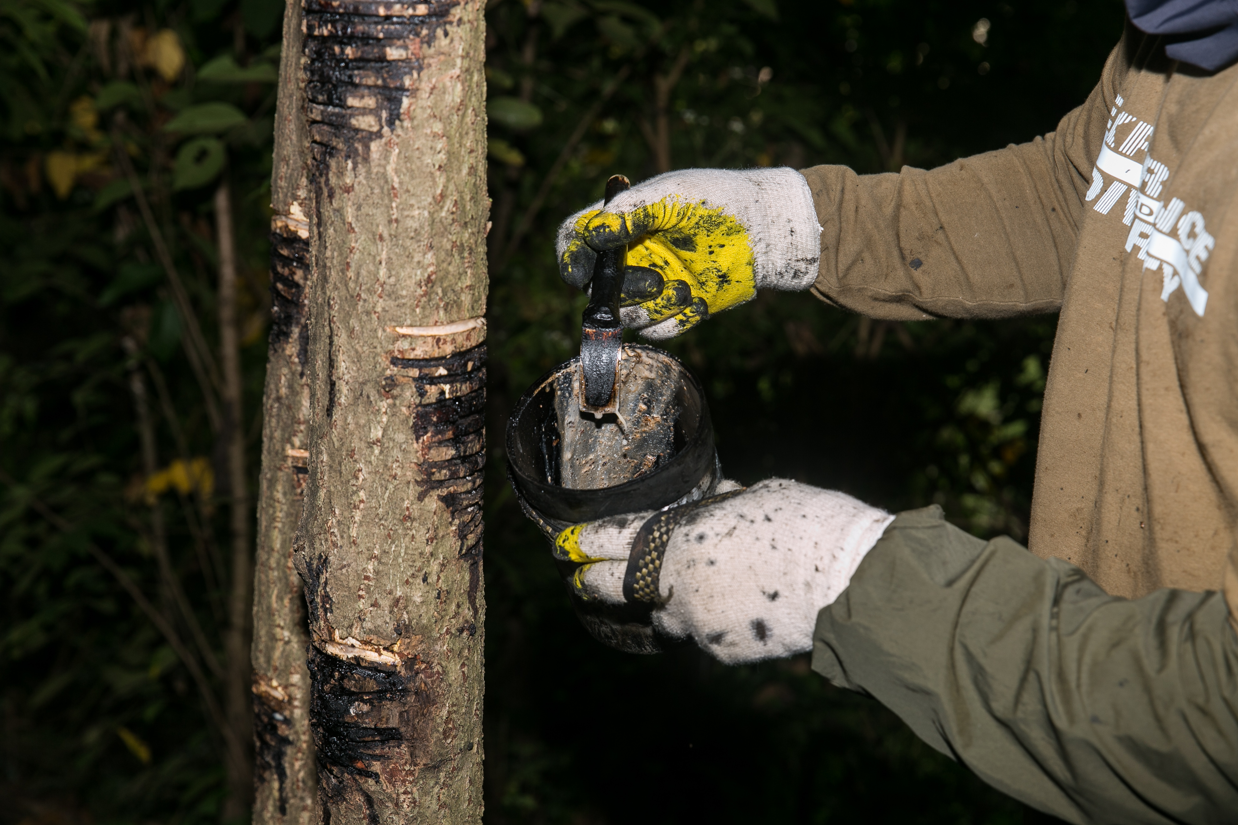 안성진 장인이 칠주걱으로 옻칠을 담는 모습