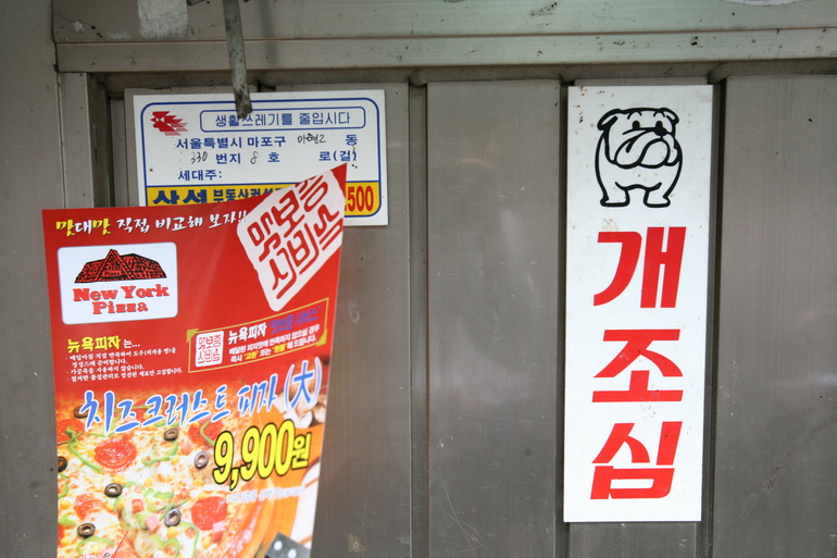 경고, 안내, 벽보 등_개조심 경고문과 피자 광고지
