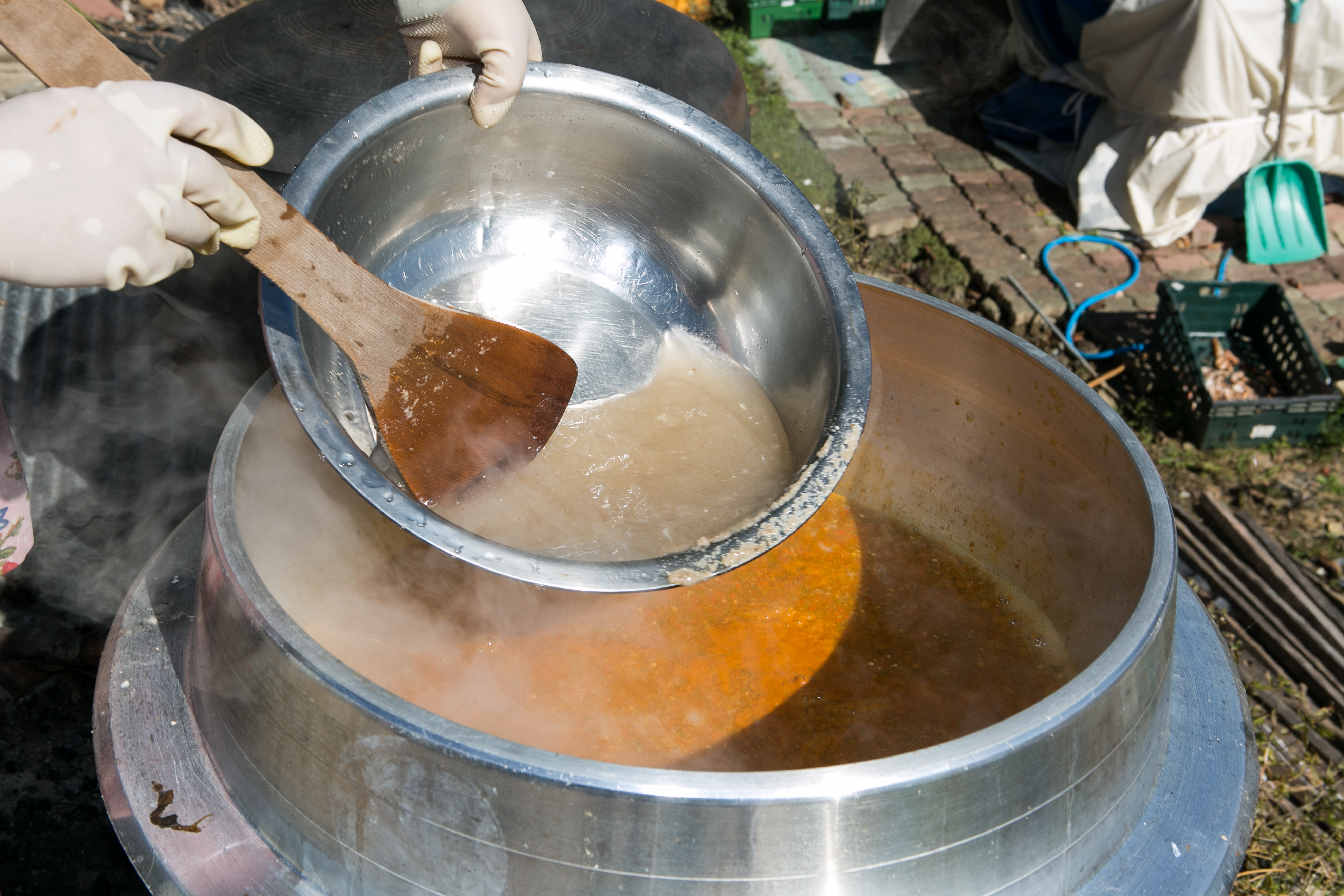 고추죽 조리 과정-갈아 놓은 표고버섯 넣기