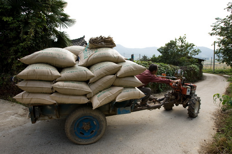 수확한 나락을 창고로 옮기는 모습